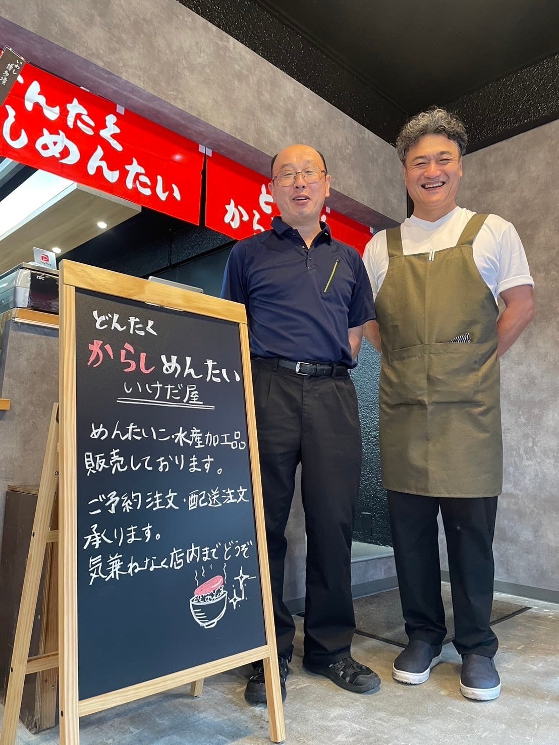 水産加工品を作るようになり、福岡市にある菜根(さいこん)問屋の集まりに大手めんたいこメーカー「ふくや」の創業者・川原俊夫氏が、韓国風に味付けされたたらこ(魚卵)を日本人向けに味付けをしたらどうか、という発案で今の「めんたいこ」の原型が出来始めました。試行錯誤の末に生みだした明太子を、川原俊夫氏は特許を取る事なく、その製法を知りたい人に惜しみなく教えました。「いろんな味があっていい」という川原俊夫氏の考えにより様々な作り手によって幅広い味が生まれ、明太子は博多を代表する名産となったのです。池田康介もその中の一人であります。